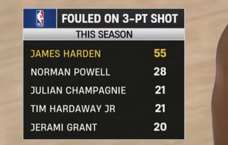 半岛体育官方网站-本赛季三分被犯规数:哈登55次独一档 鲍威尔28次第二
